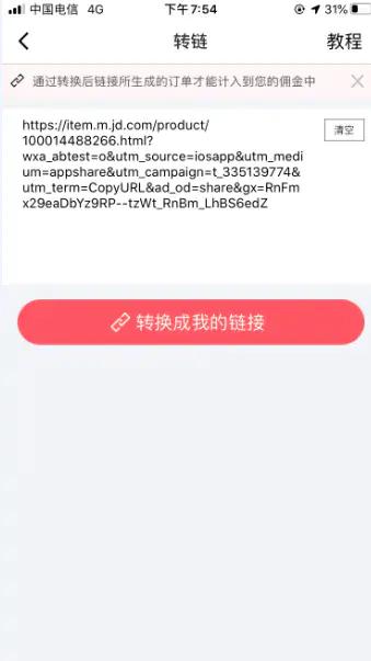 ·把刚在JD.COM复制的链接内容粘贴上去,点击【转换成我的链接】;